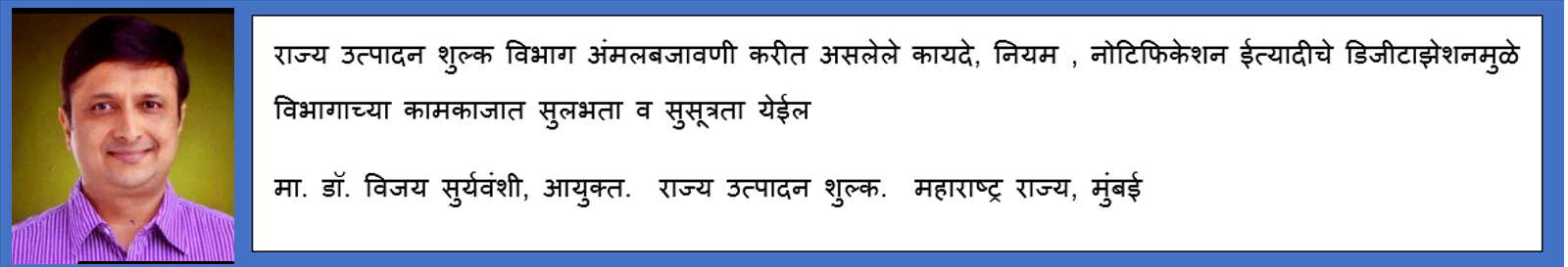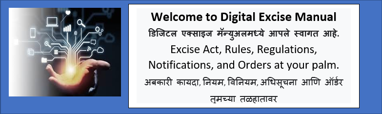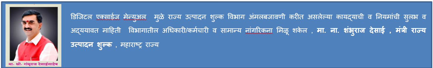 असे परस्परसंवादी, सुलभ, अद्ययावत, कालानुरुप नियंत्रित आवृत्ती असलेले Digital Excise Manual Volume I सादर करण्यास अतिशय आनंद होत असुन यासाठी मा. ना. शंभुराजे देसाई, मंत्री, राज्य उत्पादन शुल्क, मा. प्रधान सचिव श्री. मिलींद म्हैसकर, तत्कालीन मा.आयुक्त कांतीलाल उमाप यांनी व सध्याचे मा. आयुक्त डॉ. विजय सुर्यवंशी यांनी या कार्याकरीता प्रोत्साहन दिले त्याबद्दल त्यांचे आणि स्वाती काकडे (अधीक्षक), प्रमोद राजोते व आकाश जाधव (दुय्यम निरीक्षक) तसेच अधीक्षक व विभागीय उप आयुक्त कार्यालय नागपुर व पुणे येथील अधिकारी व कर्मचारी यांनी याकरीता परीश्रम घेतले त्याबद्दल त्यांचे आभार व्यक्त करुन हा Digital & Interactive Excise Manual Volume I सादर करीत आहे.
